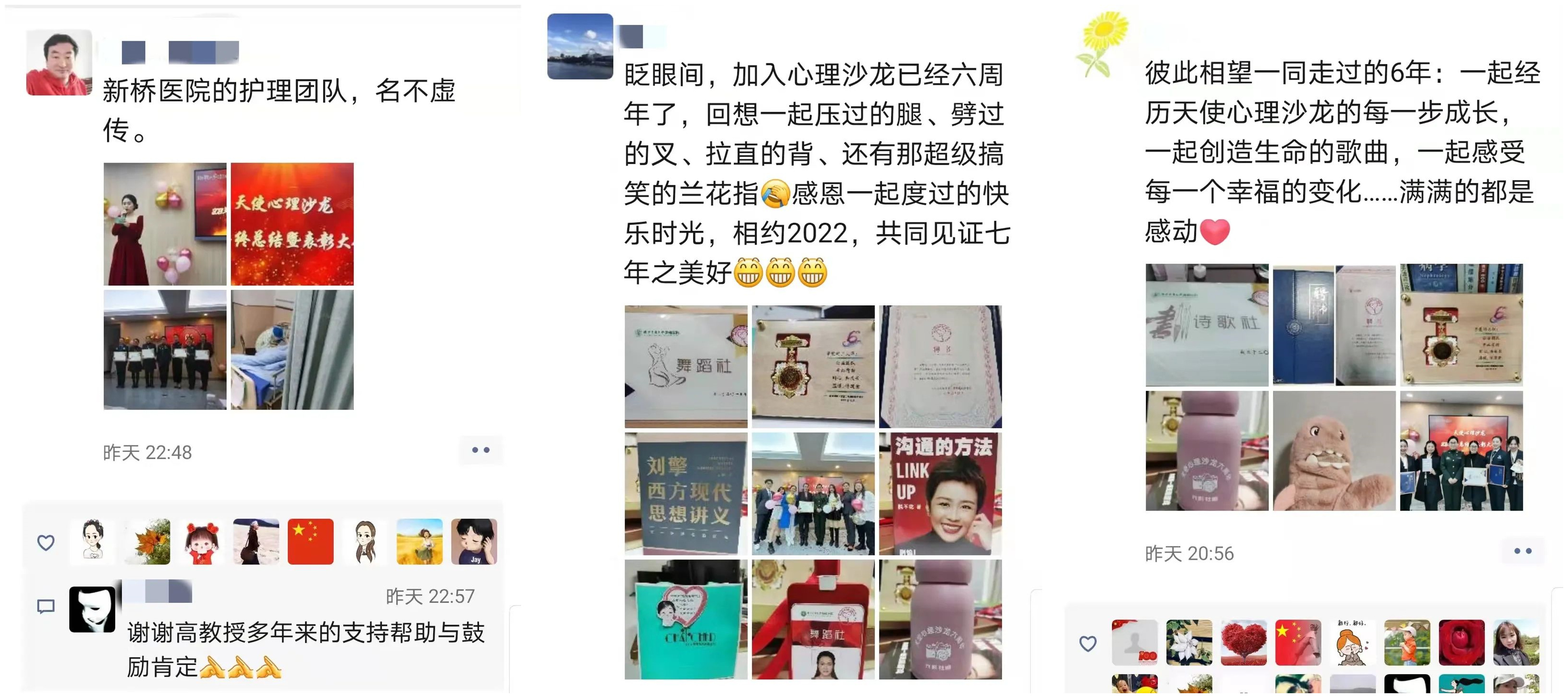 总结讲话 最后,护理处褚玲玲处长对“天使心理沙龙”第一个五年工作取得的成绩表示高度肯定与赞扬,对各位公益专家及核心成员的倾力付出表示感谢,希望大家不忘初心,点燃激情,做有心、有才、有情怀、有品质的新桥护理人,打造更温暖、更精彩、更开怀的“天使心理沙龙公益团队”。 据悉,陆军军医大学新桥医院“天使心理沙龙”公益服务平台成立于2015年,是国内首个为护士成立的心理公益服务平台,旨在促进护士心理健康,传递时代正能量,助力医院人文建设。该平台包含了光影社、舞蹈社、新语社、诗歌社、创美社五个艺术社团。六年来,平台组织开展了25场公益讲座,2.2万人次参加;团体心理辅导120次、443人参加;个案心理咨询161人次、5419分钟;五个社团开展各色艺术活动142场、开辟心理沙龙网站专区分享正能量及原创文章819篇,持续引领新桥护理团队积极健康发展,不断激发工作热情,为患者提供更优质的护理服务。