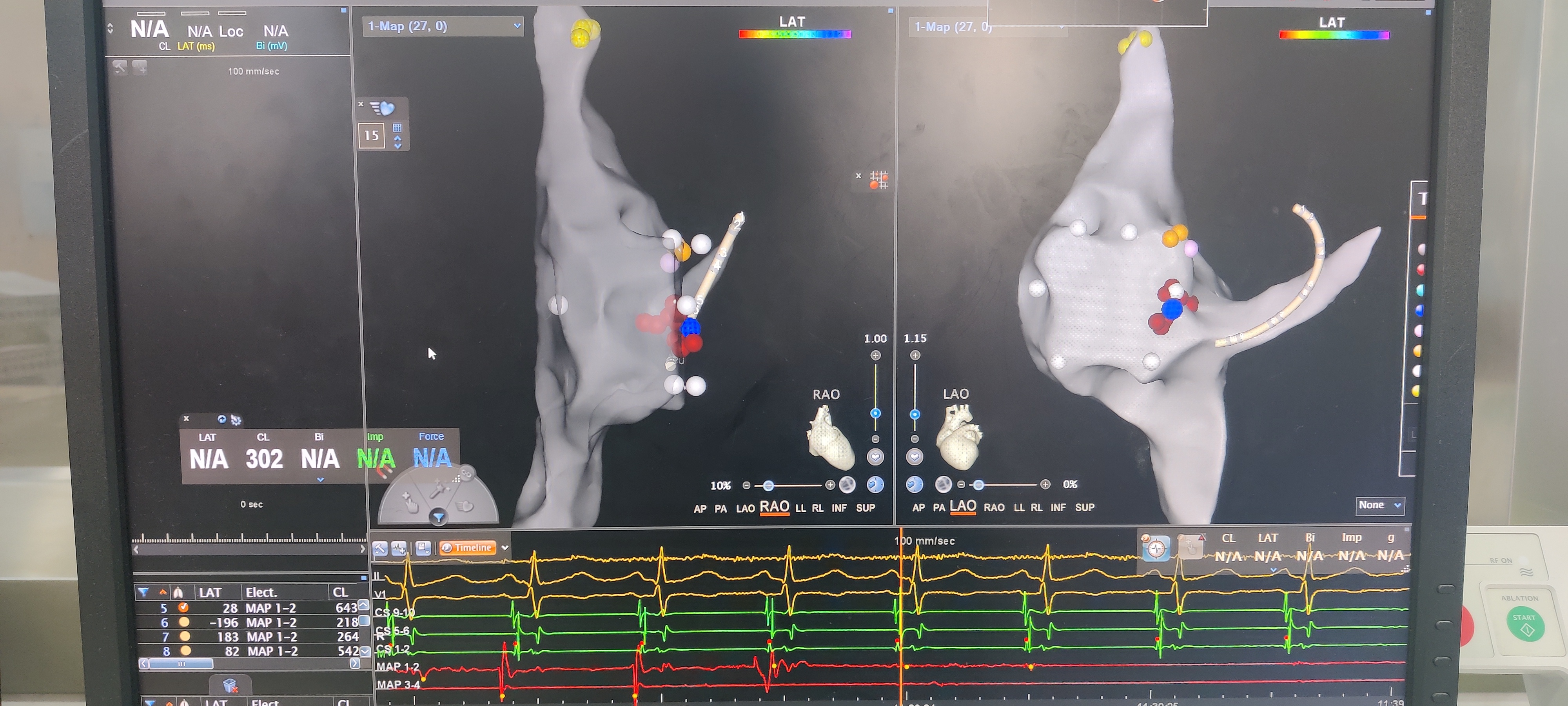 1月1日凌晨,孕26周的准妈妈罗女士(化名),自觉呼吸困难伴胸闷,她知道这是自己的老毛病心动过速发作,但此次和以往有加重,既往自己摸索有效的终止方式都不能缓解,当地医院给予了药物处理,虽能短暂终止,但很快又发作了。立即与家人赶往陆军军医大学新桥医院。但进入医院后,她的头晕、心慌、呼吸不畅的症状加剧。医生在为其心电监护期间,心率不断升高,最高达180次/分(正常人心率一般为60-100次/分),心内科电生理组谭虎团队为其确诊是妊娠合并阵发性室上速,情况十分危急,孕妇和胎儿随时可能有生命危险。 原来罗女士在13岁曾经因为阵发性室上速做过一次射频消融,术后没再发作心动过速,这次怀孕1个多月时候,再次出现心动过速,心率高达170-190次/分,开始还能自行终止,后面随着孕期进展,发作越来越勤,以至于近期需要到外院静脉推注药物才能终止。 “患者心动过速考虑是阵发性室上速发作,诱因可能是妊娠,随着孕期的增加,发作可能会越来越频繁。目前安全终止孕妇室上速的药物疗效比较短暂,不能长期有效控制心动过速发作,而心率长期处于高水平的180次/分左右,可能很快会诱发心力衰竭等症状,会严重影响孕妇和胎儿的安全。有些高敏孕妇可能数小时或者数十小时就会出现这类情况。只有再次射频消融术才能控制住。但同时也要注意围术期的操作对孕妇和胎儿的影响,尽量减少不必要的操作和检查,同时严密监测孕妇生命体征及胎儿发育情况。”心内科电生理组谭虎教授在会诊讨论后决定为患者在零射线下,实施射频消融术,终止罗女士的心动过速。 经过术前充分准备,在科室晋军主任的带领下,谭虎副主任率电生理团队通力合作,在产科老师的围术期支持下,在三维标测系统辅助下,全程零射线,找到病灶靶点之后,心动过速被成功终止,因为是二次射频消融术,术中也反复观察及验证,确保消融疗效。