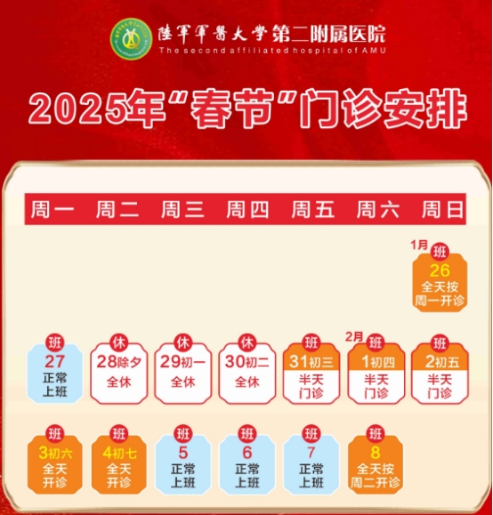春节,一个象征团圆与温暖的节日,对于无数家庭而言,是辞旧迎新的时刻,是出行和聚会的高峰。然而,当大家都沉浸在欢庆之中时,却有一些人被健康问题所困扰,大家需要注意防范。为了保障大家在春节期间能同样享受到及时、贴心专业的诊疗服务,陆军军医大学新桥医院门诊安排如下: