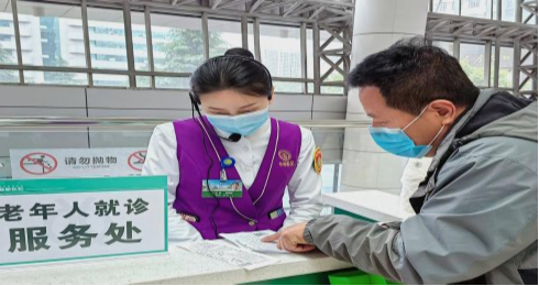 3、设立多点位“助老服务队”除一站式服务中心之外,我们还在各楼层E区上行扶梯处固定设立了“老年人就诊服务处”,实时为患者答疑解惑。在诊区、窗口、各楼层自助服务区、综合服务中心及候诊大厅等重要位置,移动设置助老导医、助老保洁与助老保安,均佩戴醒目的臂章,时刻关注老年人的独特需求,随时为他们提供便捷的移动咨询、贴心的引导与无私的帮助。