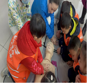 门诊部责任组长徐艳将“七步洗手法”编成朗朗上口的儿歌,带着孩子们边唱边练。在轻松的氛围中,孩子们掌握了洗手的关键时机和规范动作,也明白了“手卫生是预防疾病的第一道防线”。 急救初体验:黄金四分钟守护生命 “有人晕倒了,我们该怎么办?”