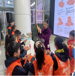 活动在“健康小先锋·礼仪培训”中拉开帷幕。门诊部一楼组长余剑芝通过情景模拟,手把手教孩子们如何用微笑传递友善。孩子们主动向来往患者问好,一句句稚嫩的“您好”、“祝您早日康复”,让候诊区暖意融融。 小手洗香香,细菌跑光光 “掌心对掌心,手指交叉搓一搓……”