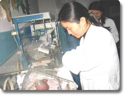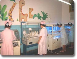 | 新生儿室实行全天候无陪伴特别护理,拥有呼吸机、多功能监护仪、微量血气、血生化分析仪、血氧饱和度与二氧化碳分压测定仪、经皮胆红素测定仪、新生儿暖箱、新生儿光疗箱、微量输液泵等先进的医疗仪器。专业人员具有丰富临床经验,不仅对新生儿感染性疾病、围产期疾病,病理性黄疸等常见病,多发病诊治快捷,而且对少见病、畸形、遗传代谢性疾病等也能明确诊断,已成功救治新生儿及早产儿数千人,出生体重仅750克的早产儿已在我科救治存活。积极开展新技术、新方法救治新生儿疾病:如高压氧舱辅助治疗新生儿缺氧缺血性脑病、支气管肺泡灌洗及呼吸机辅助抢救胎粪吸入综合征、双管同步换血救治新生儿溶血症,开展新生儿神经行为学评估,用综合方法对脑损伤进行早期干预等,将小儿神经系统疾病预防、保健、临床及康复融为一体,有效提高了新生儿的存活率,降低了体智障碍的发生率。 |