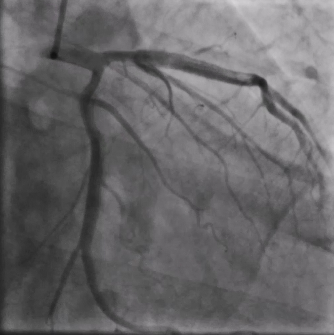 重庆江北区的65岁李先生反复心前区疼痛2年,半年前在外院前降支近端植入支架一枚,术后症状仍然反复,曾在多家医院就诊,无法明确原因。近日到新桥医院就诊,医院心血管内科为李先生安排了冠脉造影检查,结果提示:前降支支架内未见明显狭窄,但血流速度较正常冠脉明显变慢。