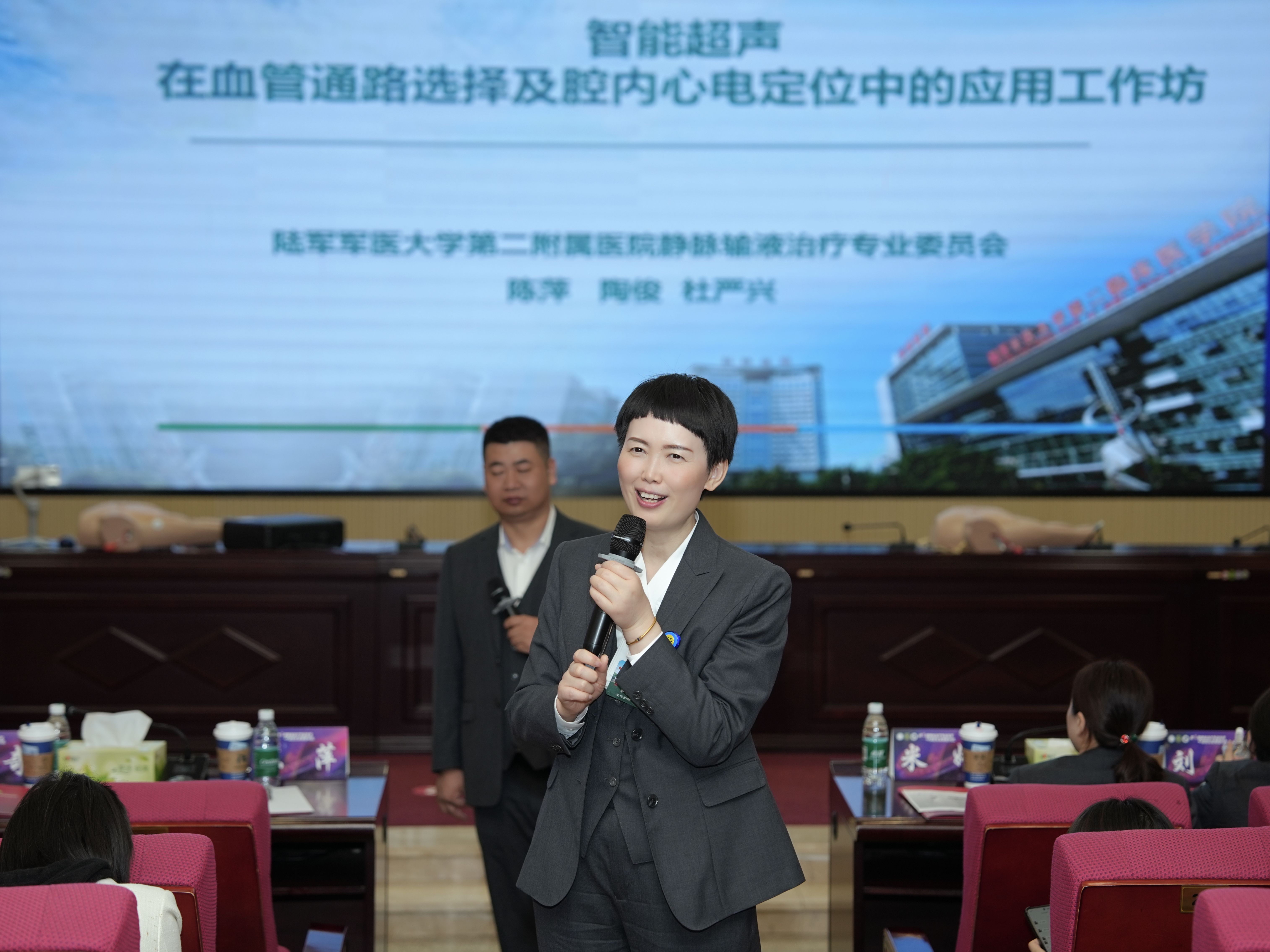 实操工作坊聚焦智能化技术在静疗领域的创新应用,成为本次培训的一大亮点。来自新桥医院护理处的陈萍总护士长及血液病医学中心的陶俊护士长通过理论、视频、实操等环节,让参训学员沉浸式参与并掌握了AI超声在PICC置管中的应用(血管通路选择及导管尖端定位)。